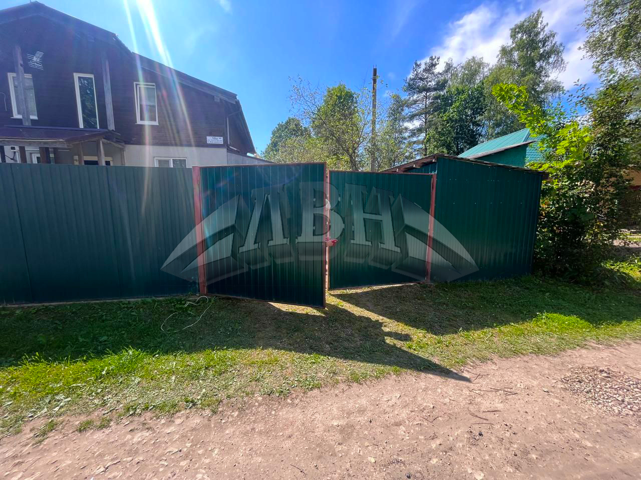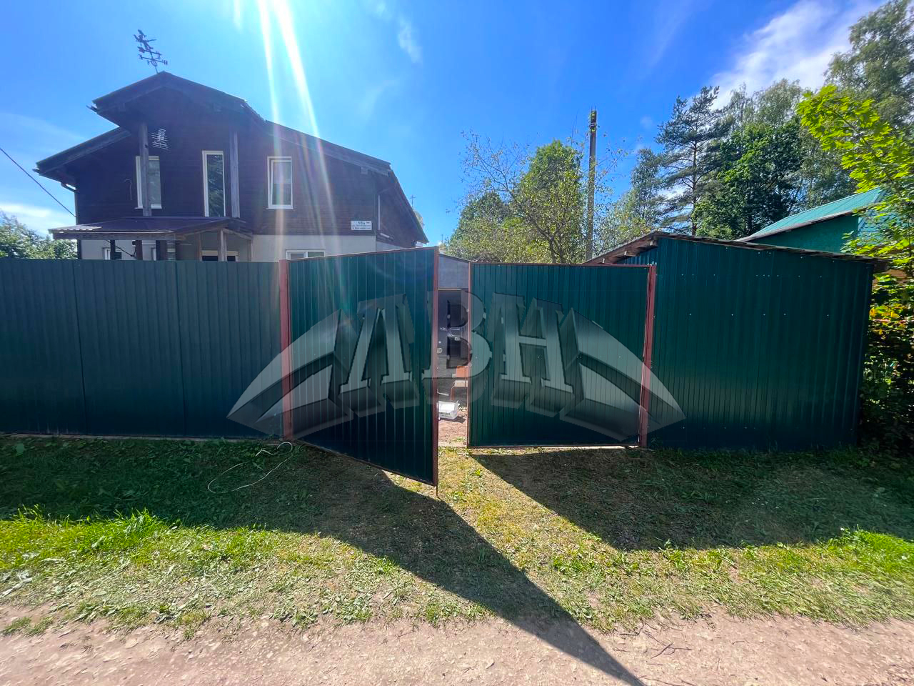 Распашные уличные ворота, обшитые профлистом. Сданный объект - Ленинградская обл., Гатчинский р-н, п. Карташевская.